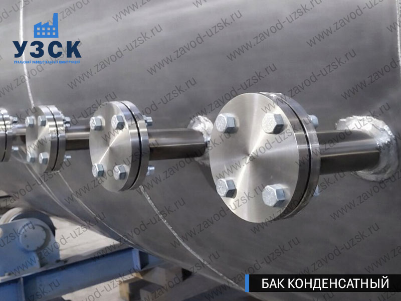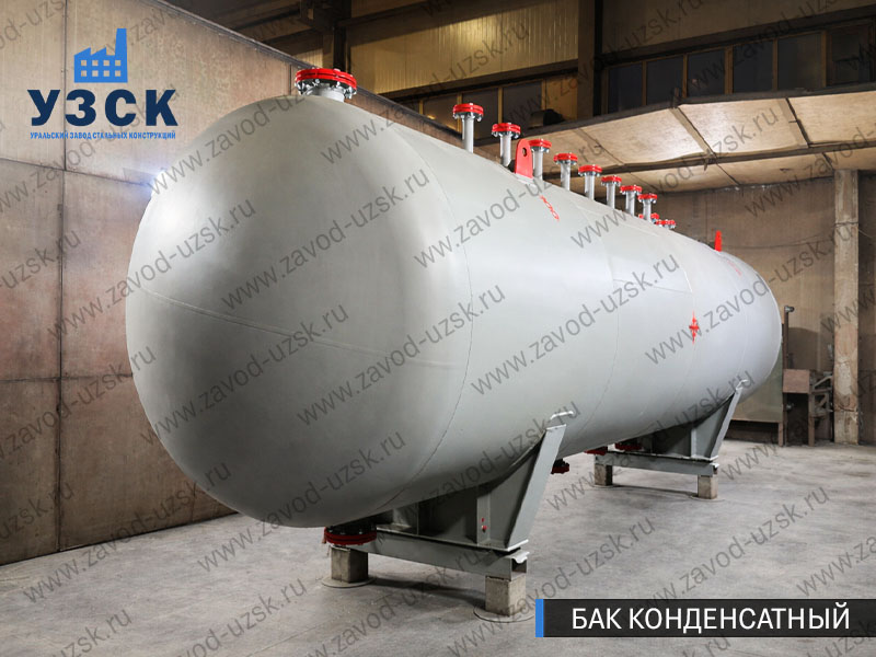 Конденсатный бак объемом 20 м³ также выполнен из стали 09Г2С. Его рабочий объем составляет 18,7 м³, полный объем — 20,4 м³. Расчетное давление — 0,05 МПа, гидроиспытательное — 0,07 МПа, рабочая температура — до 110 °С. Конструкция подготовлена к промышленной эксплуатации и транспортировке, включая необходимую комплектацию заглушками, прокладками и крепежом.