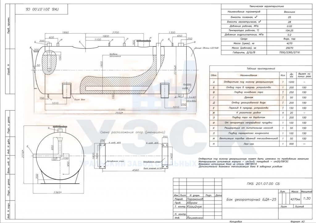 Оборудование выпускается по стандартизированным чертежам БДА, рассчитанным на котельные малой и средней мощности. Как пример, бак деаэраторный БДА 25, который демонстрирует рабочий чертеж.
